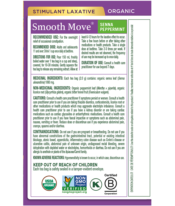 Directions for use: Pour 150 mL freshly boiled water over 1 tea bag in a cup and steep, covered, for 10-30 minutes. Gently squeeze the tea bag to release any remaining extract. Allow at least 6-12 hours for the laxative effect to occur. Take a few hours before or after taking other medications or health products. Take a single dose at bedtime. Take 2-3 times per week. If desired results are not observed, the frequency of use may be increased up to once daily.